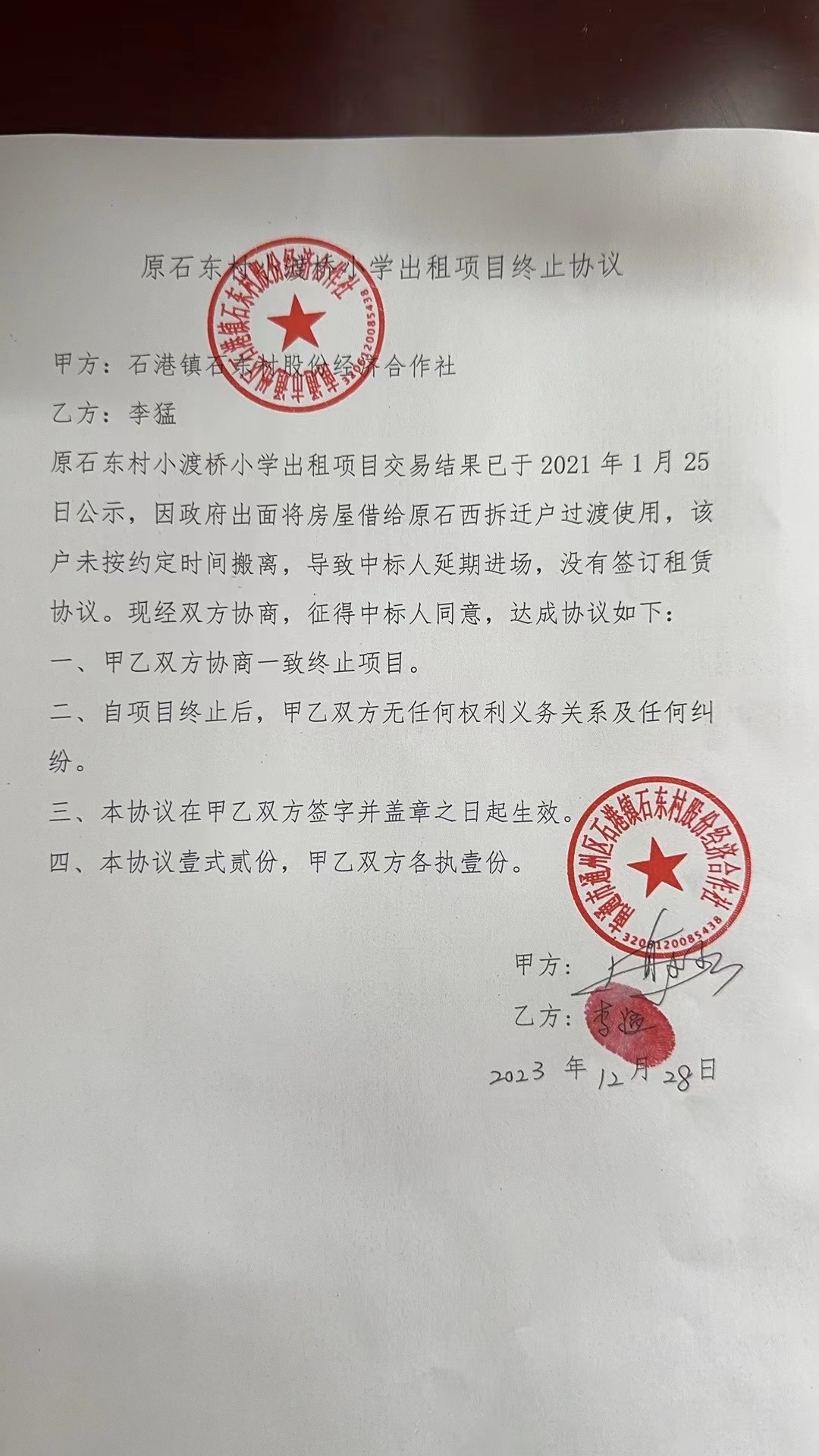 关于石港镇石东村原小渡桥小学租赁项目终止公告